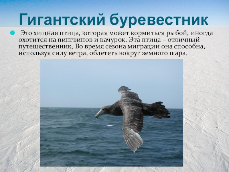 Морской леопард – опасный хищник, который обитает в водах Южного океана. Быть хищником этому животному позволяет его тонкий слой жира и развитая мускулатура. Благодаря этому он достаточно подвижен и может убивать тюленей, крупную рыбу, пингвинов. Не брезгует морской леопард и мясом убитых китов. Но за тонкий подкожный жир приходится платить меньшей устойчивостью к холодам.