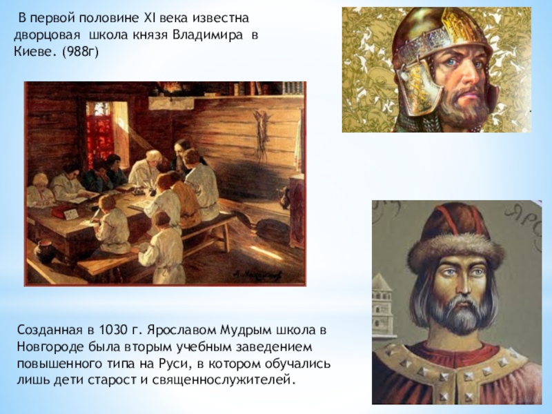 В первой половине XI века известна дворцовая школа князя Владимира в Киеве. (988г)