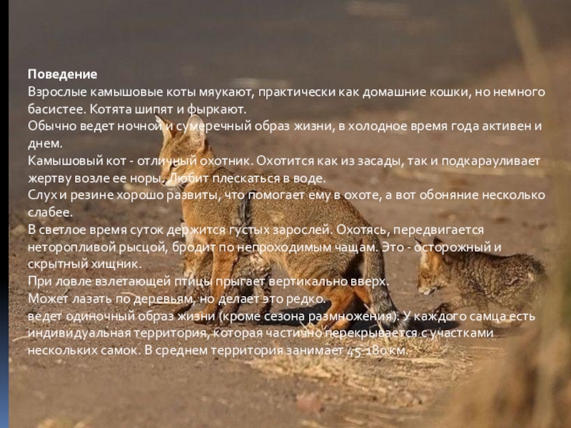 ПоведениеВзрослые камышовые коты мяукают, практически как домашние кошки, но немного басистее. Котята шипят и фыркают.Обычно ведет ночной и сумеречный образ жизни, в холодное время года активен и днем. Камышовый кот - отличный охотник. Охотится как из