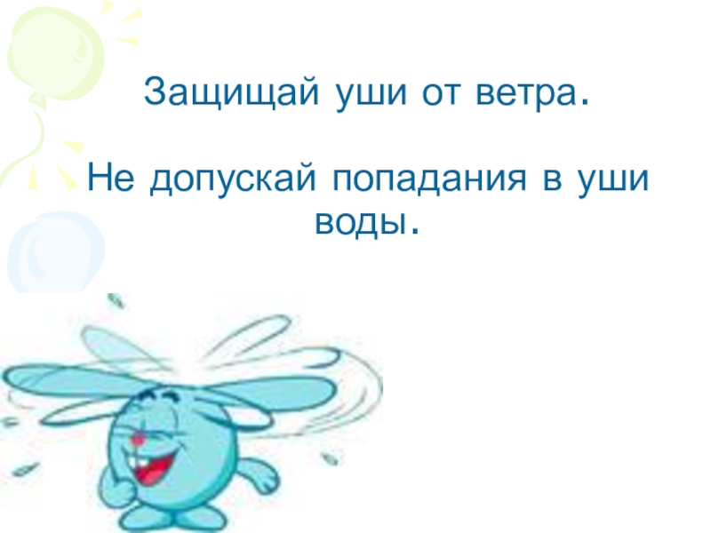 Слайд 12Защищай уши от ветра. Не допускай попадания в уши воды.
