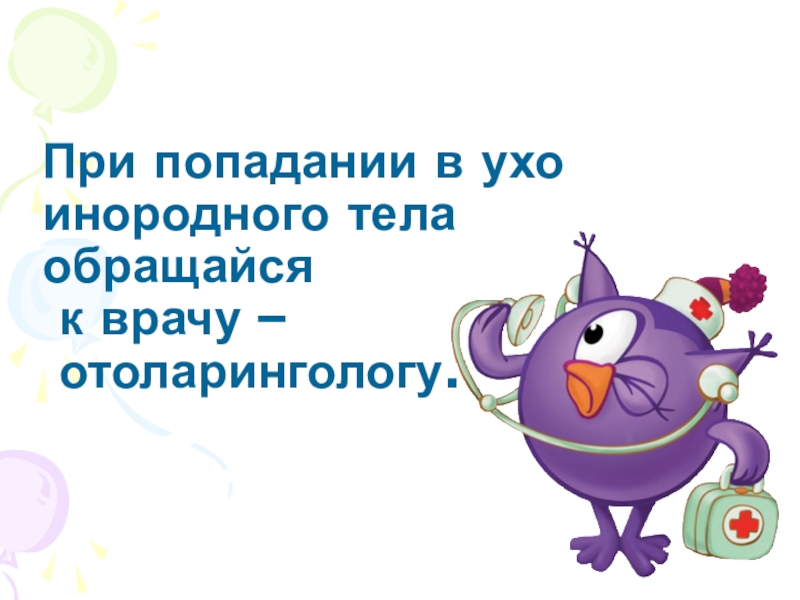 Слайд 13При попадании в ухо инородного тела обращайся к врачу – отоларингологу.