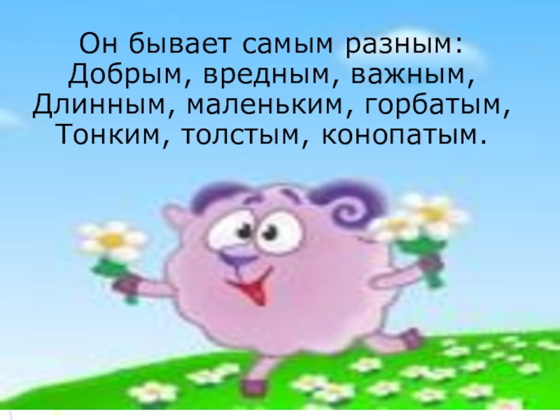 Слайд 16Он бывает самым разным: Добрым, вредным, важным, Длинным, маленьким, горбатым, Тонким, толстым, конопатым.