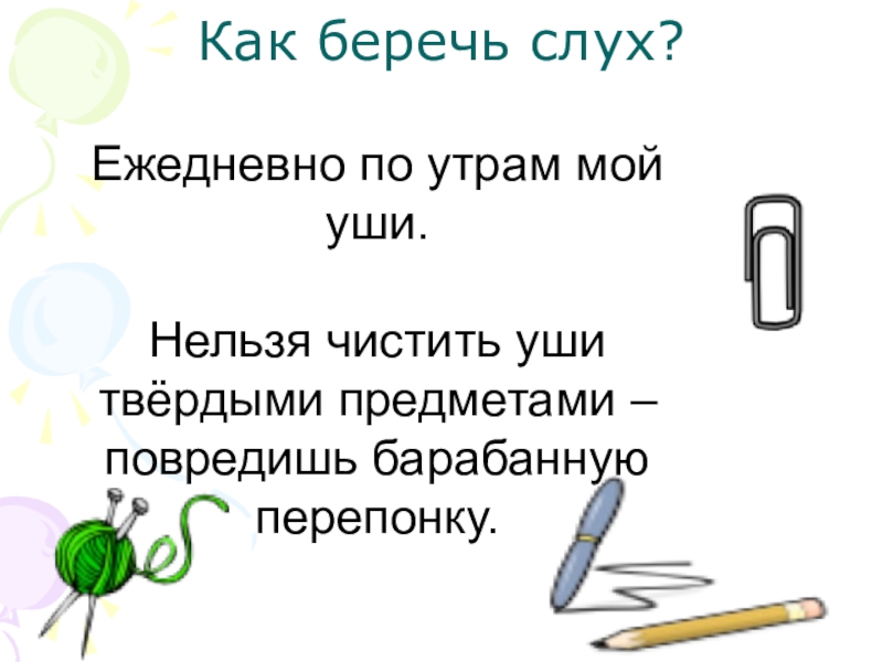 Как беречь слух?Ежедневно по утрам мой уши.  Нельзя чистить уши твёрдыми предметами – повредишь барабанную перепонку.