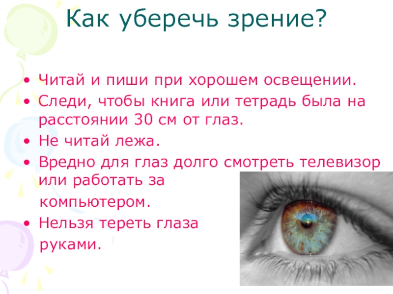 Как уберечь зрение?Читай и пиши при хорошем освещении.Следи, чтобы книга или тетрадь была на расстоянии 30 см