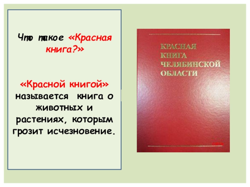 Что такое «Красная книга?»«Красной книгой» называется книга о животных и растениях, которым грозит исчезновение.