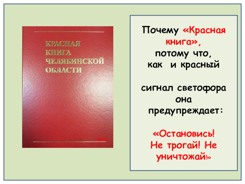 Почему «Красная книга», потому что, как и красный сигнал светофора она предупреждает: «Остановись! Не трогай! Не уничтожай!»