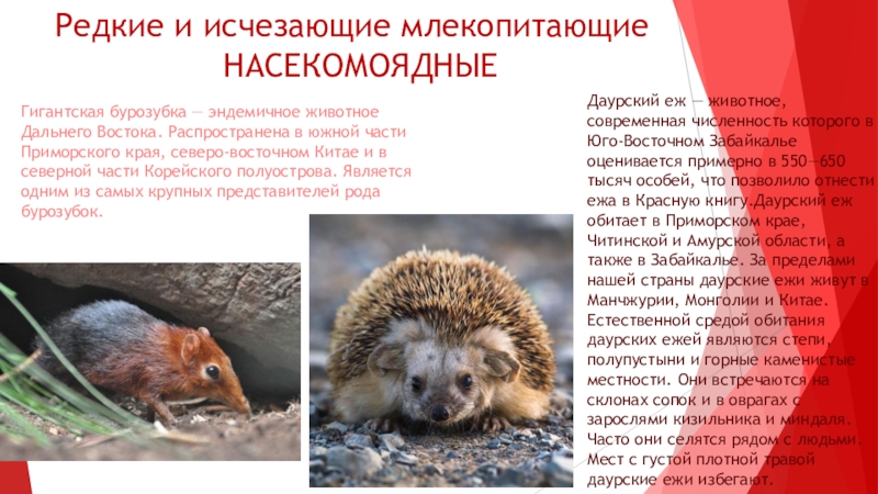 Даурский еж — животное, современная численность которого в Юго-Восточном Забайкалье оценивается примерно в 550—650 тысяч особей, что позволило отнести ежа в Красную книгу.Даурский еж обитает в Приморском крае, Читинской и Амурской области, а также в Забайкалье. За пределами нашей страны даурские ежи живут в Манчжурии, Монголии и Китае.Естественной средой обитания даурских ежей являются степи, полупустыни и горные каменистые местности. Они встречаются на склонах сопок и в оврагах с зарослями кизильника и миндаля. Часто они селятся рядом с людьми. Мест с густой плотной травой даурские ежи избегают.