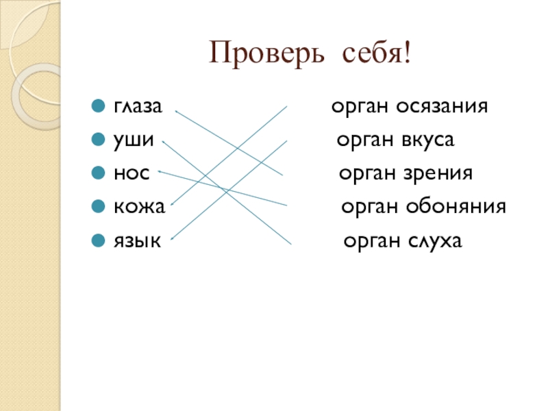 Проверь себя!глаза             орган осязанияуши