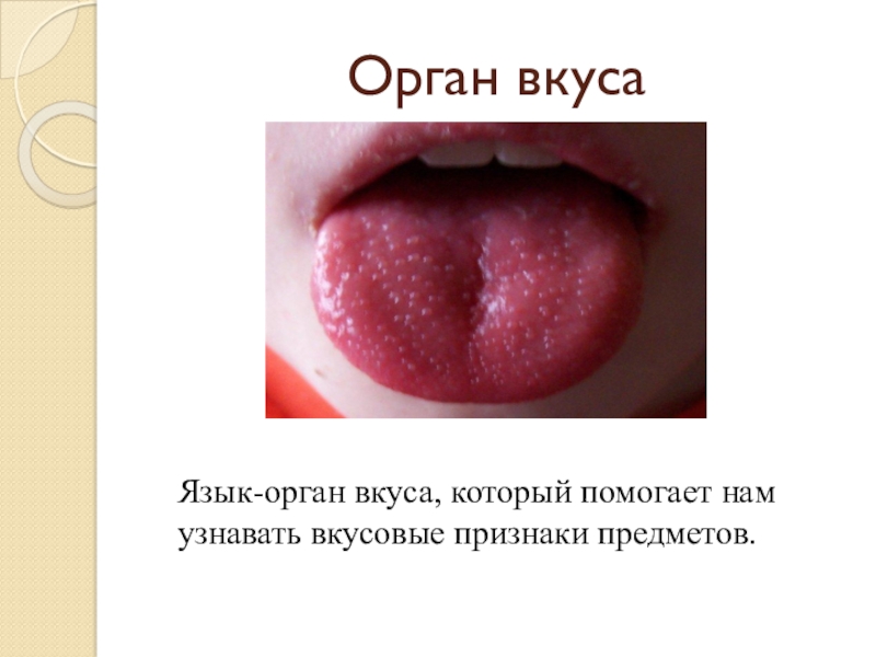 Орган вкусаЯзык-орган вкуса, который помогает нам узнавать вкусовые признаки предметов.