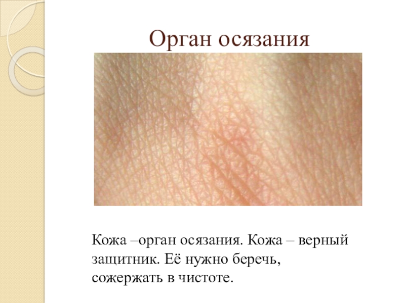Орган осязанияКожа –орган осязания. Кожа – верный защитник. Её нужно беречь, сожержать в чистоте.