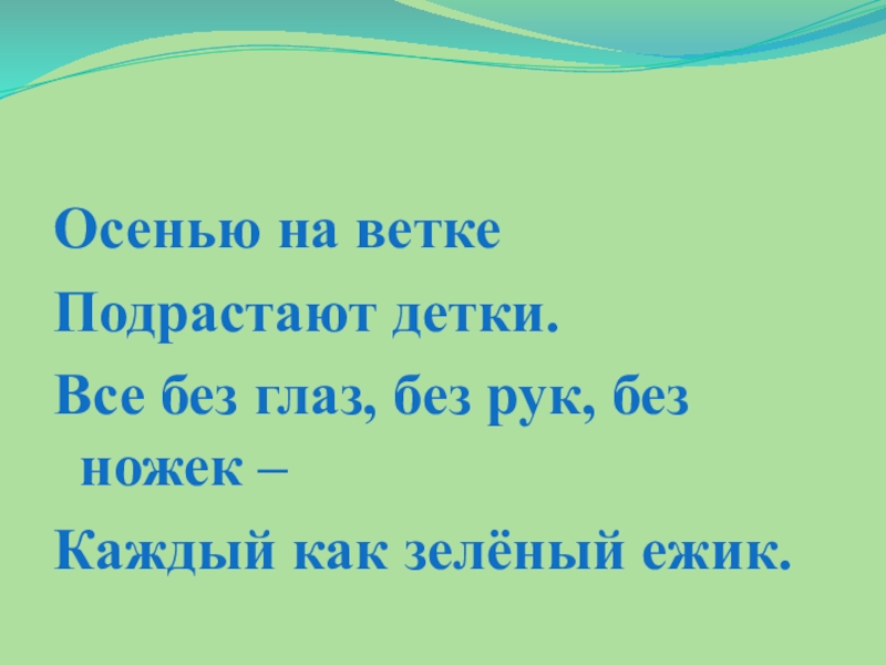 Осенью на ветке Подрастают детки. Все без глаз, без рук, без ножек – Каждый как зелёный ежик.