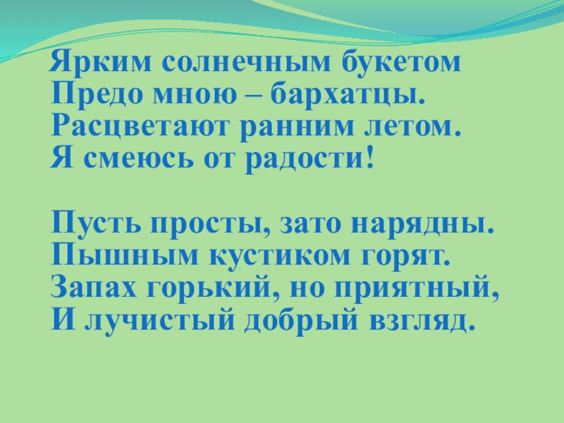 Слайд 16 Ярким солнечным букетом Предо мною – бархатцы. Расцветают ранним летом. Я