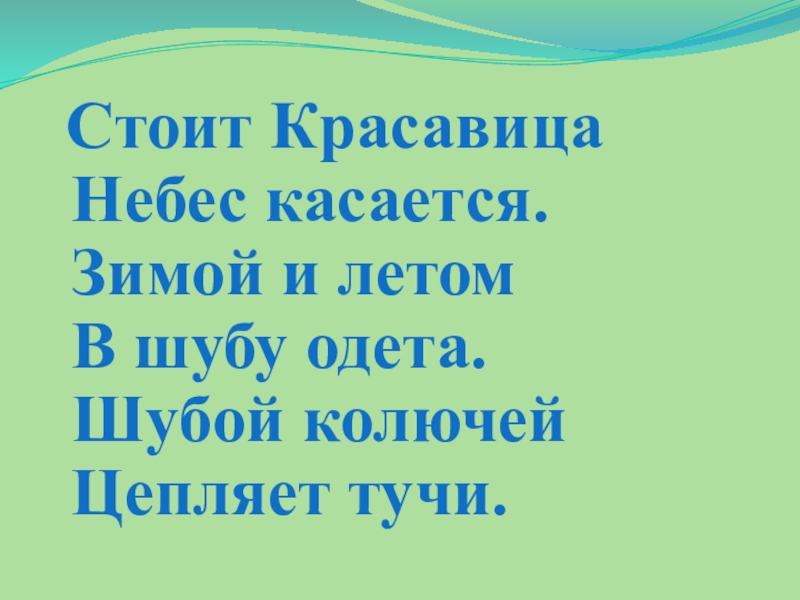 Слайд 10 Стоит Красавица Небес касается. Зимой и летом В шубу одета. Шубой колючей Цепляет тучи.