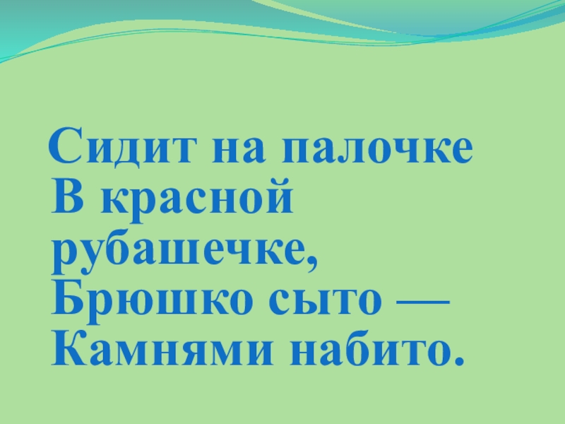 Слайд 14 Сидит на палочке В красной рубашечке, Брюшко сыто — Камнями набито.