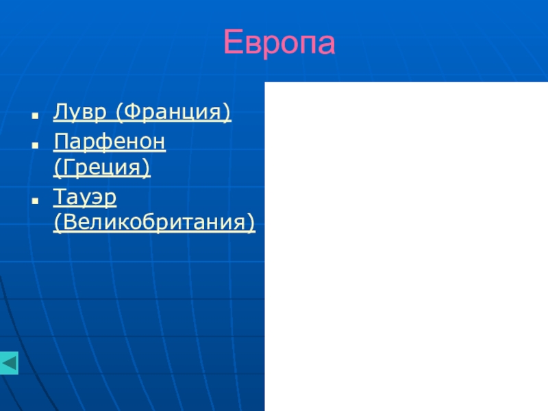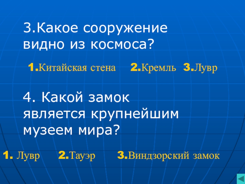 1. Лувр 2.Тауэр 3.Виндзорский замок