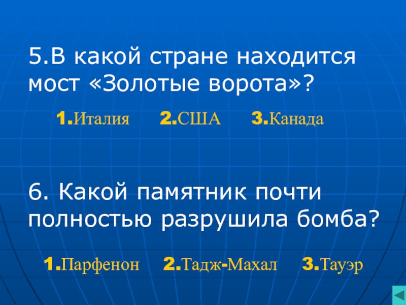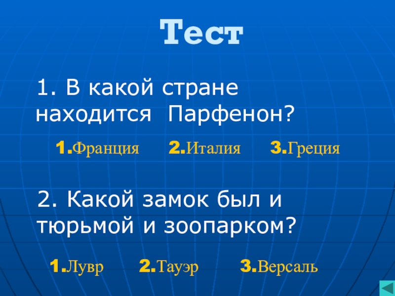 1.Парфенон 2.Тадж-Махал 3.Тауэр