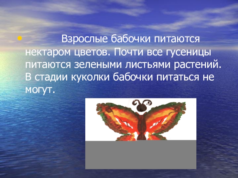 Бабочки Бабочки бывают дневные и ночные, красивые и так себе. Дневные бабочки летают днем, а ночью отсиживаются