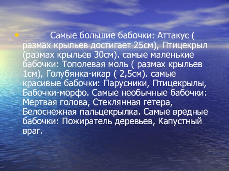 крыльев достигает 25см), Птицекрыл (размах крыльев 30см). самые маленькие бабочки: Тополевая моль ( размах крыльев 1см), Голубянка-икар ( 2,5см). самые красивые бабочки: Парусники, Птицекрылы, Бабочки-морфо. Самые необычные бабочки: Мертвая голова, Стеклянная гетера, Белоснежная пальцекрылка. Самые вредные бабочки: Пожиратель деревьев, Капустный враг.