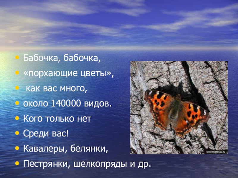 Бабочка, бабочка, «порхающие цветы», как вас много, около 140000 видов.Кого только нетСреди вас!Кавалеры, белянки,Пестрянки, шелкопряды и др.
