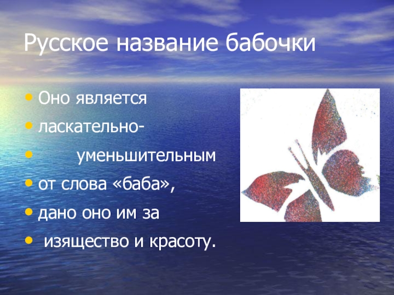 Русское название бабочкиОно является ласкательно-    уменьшительнымот слова «баба», дано оно им за изящество и