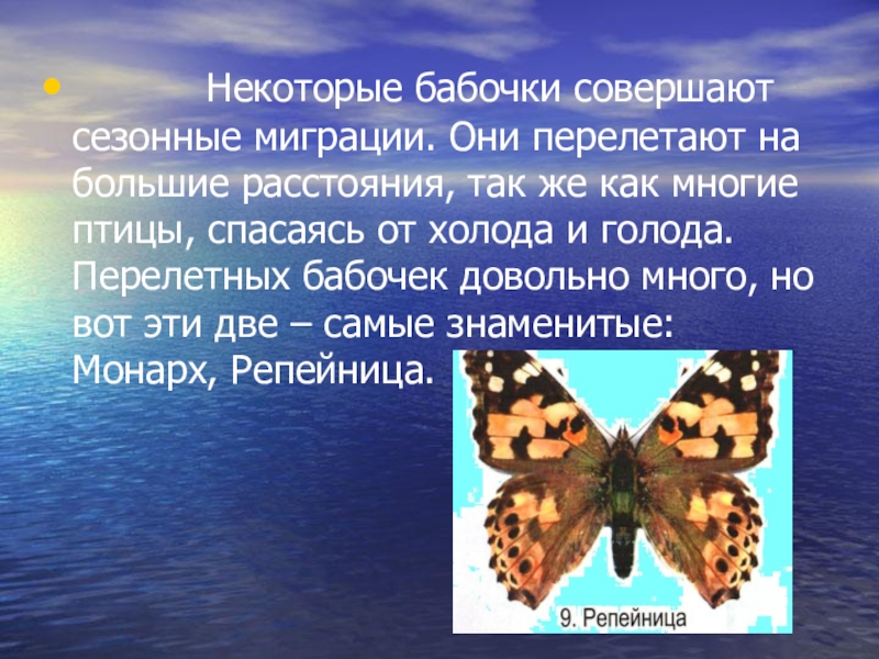 Они перелетают на большие расстояния, так же как многие птицы, спасаясь от холода и голода. Перелетных бабочек довольно много, но вот эти две – самые знаменитые: Монарх, Репейница.