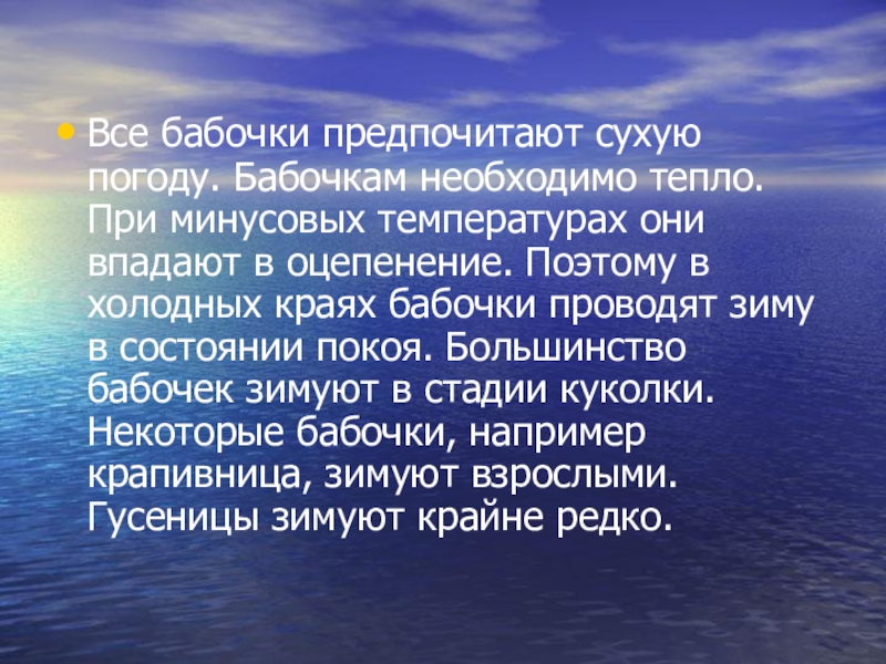Все бабочки предпочитают сухую погоду. Бабочкам необходимо тепло. При минусовых температурах