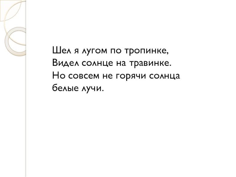 Шел я лугом по тропинке, Видел солнце на травинке. Но совсем не горячи солнца белые лучи.