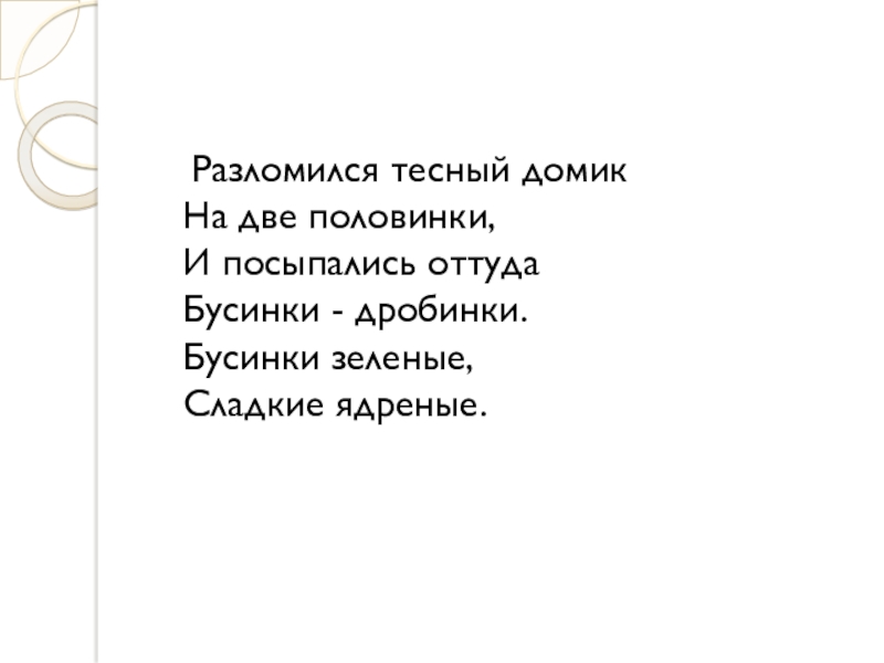 Разломился тесный домик На две половинки, И посыпались оттуда Бусинки - дробинки. Бусинки зеленые, Сладкие ядреные.