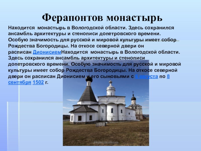 и стенописи допетровского времени. Особую значимость для русской и мировой культуры имеет собор Рождества Богородицы. На откосе северной двери он расписан ДионисиемНаходится монастырь в Вологодской области. Здесь сохранился ансамбль архитектуры и стенописи допетровского времени. Особую значимость для русской и мировой культуры имеет собор Рождества Богородицы. На откосе северной двери он расписан Дионисием и его сыновьями с 6 августа по 8 сентября 1502 г.