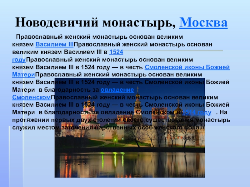 основан великим князем Василием III в 1524 году — в честь Смоленской иконы Божией МатериПравославный женский монастырь основан великим князем Василием III в 1524 году — в честь Смоленской иконы Божией Матери в благодарность за овладение СмоленскомПравославный женский монастырь основан великим князем Василием III в 1524 году — в честь Смоленской иконы Божией Матери в благодарность за овладение Смоленском в 1514 году . На протяжении первых двух столетий своего существования монастырь служил местом заточения царственных особ женского пола.