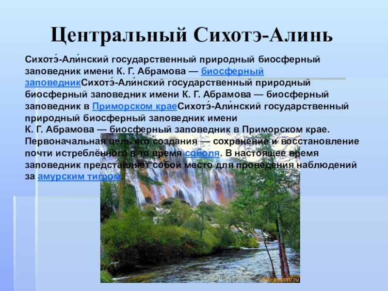 К. Г. Абрамова — биосферный заповедникСихотэ́-Али́нский государственный природный биосферный заповедник имени К. Г. Абрамова — биосферный заповедник в Приморском краеСихотэ́-Али́нский государственный природный биосферный заповедник имени К. Г. Абрамова — биосферный заповедник в Приморском крае. Первоначальная цель его создания — сохранение и восстановление почти истреблённого в то время соболя. В настоящее время заповедник представляет собой место для проведения наблюдений за амурским тигром.