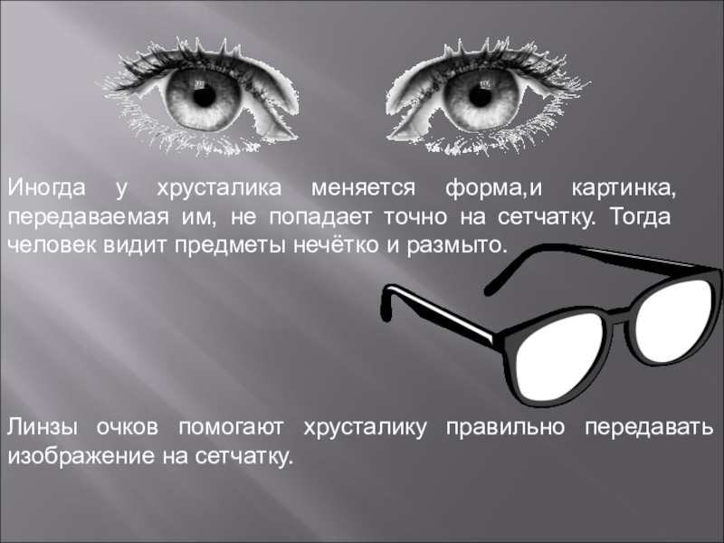 Линзы очков помогают хрусталику правильно передавать изображение на сетчатку.