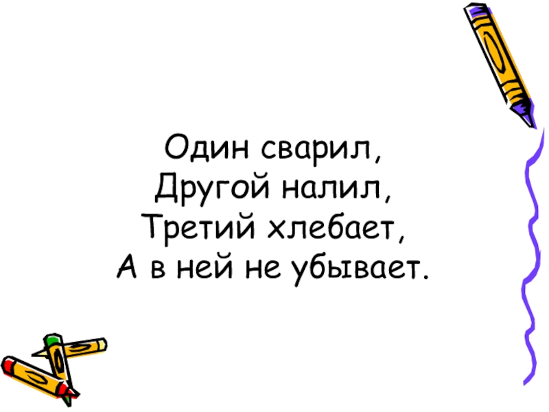 Слайд 9Один сварил, Другой налил, Третий хлебает, А в ней не убывает.