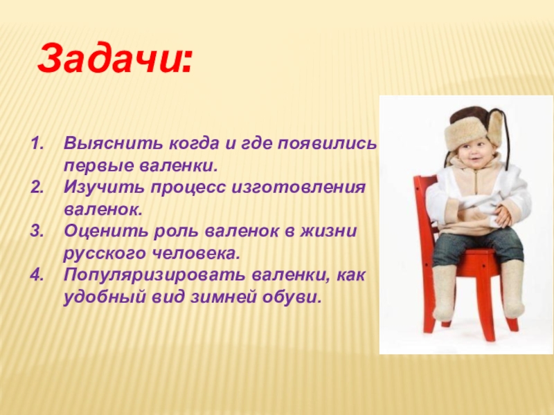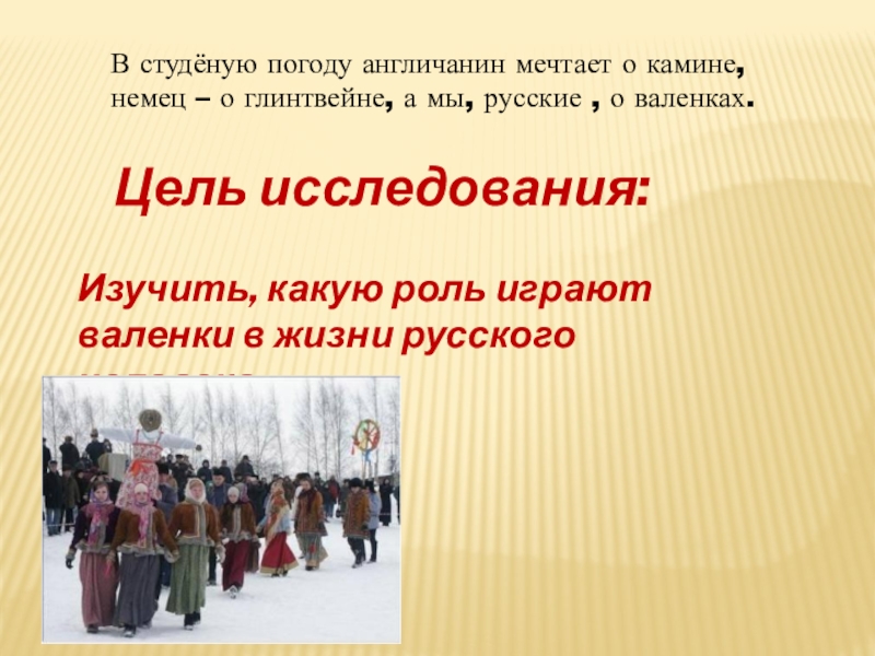 Изучить, какую роль играют валенки в жизни русского человека.