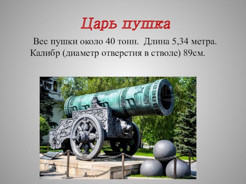 Царь пушка     Вес пушки около 40 тонн. Длина 5,34 метра.   Калибр