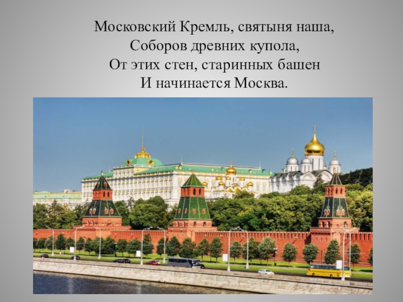 Московский Кремль, святыня наша, Соборов древних купола, От этих стен, старинных башен  И начинается Москва.