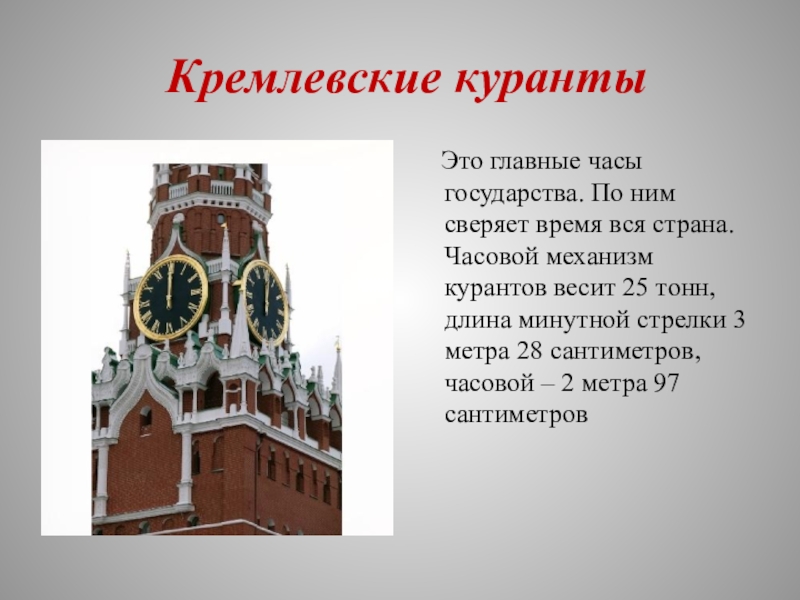 Кремлевские куранты  Это главные часы государства. По ним сверяет время вся страна. Часовой механизм курантов весит