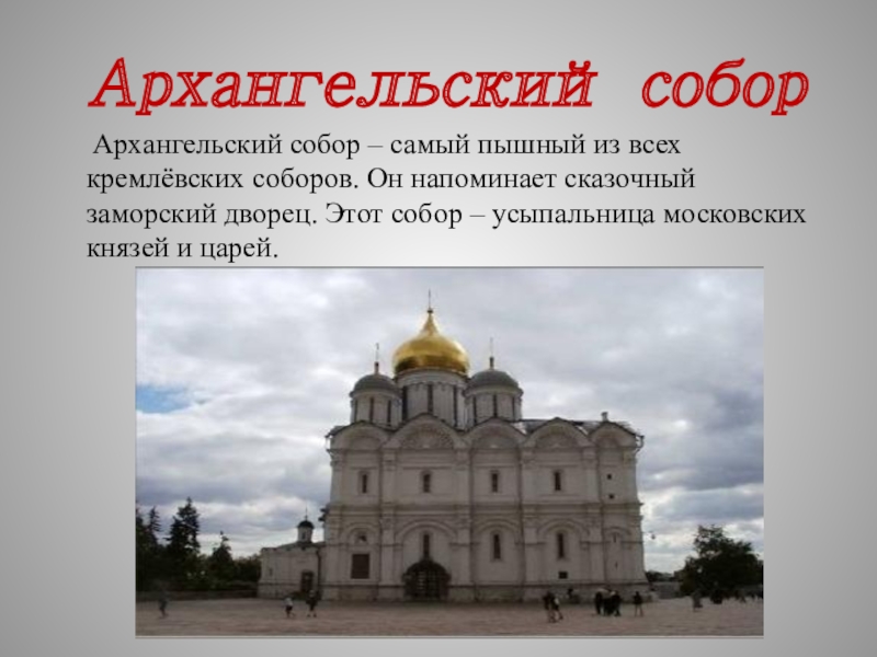 кремлёвских соборов. Он напоминает сказочный заморский дворец. Этот собор – усыпальница московских князей и царей.