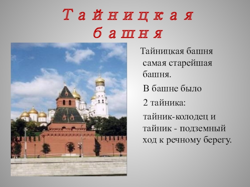 Тайницкая башня  Тайницкая башня самая старейшая башня.  В башне было  2 тайника:  тайник-колодец