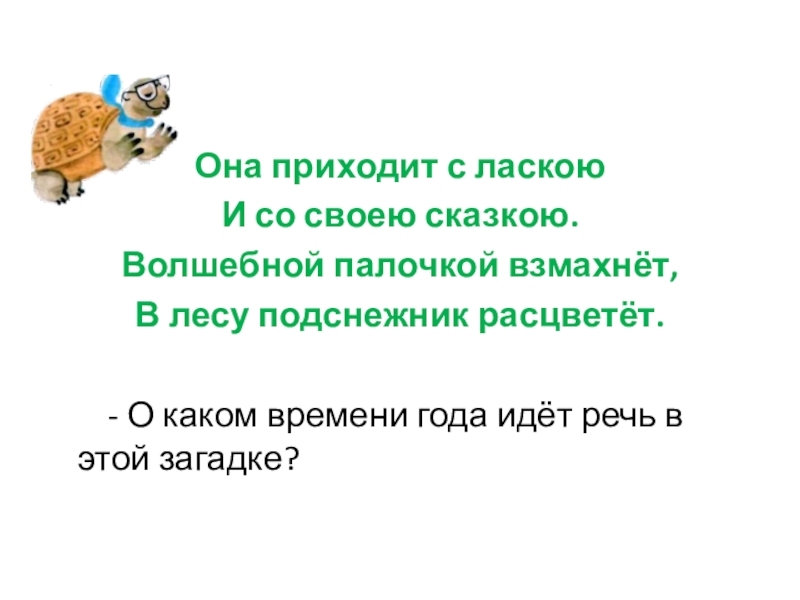 Она приходит с ласкоюИ со своею сказкою.Волшебной палочкой взмахнёт,В лесу подснежник расцветёт.- О каком времени года идёт
