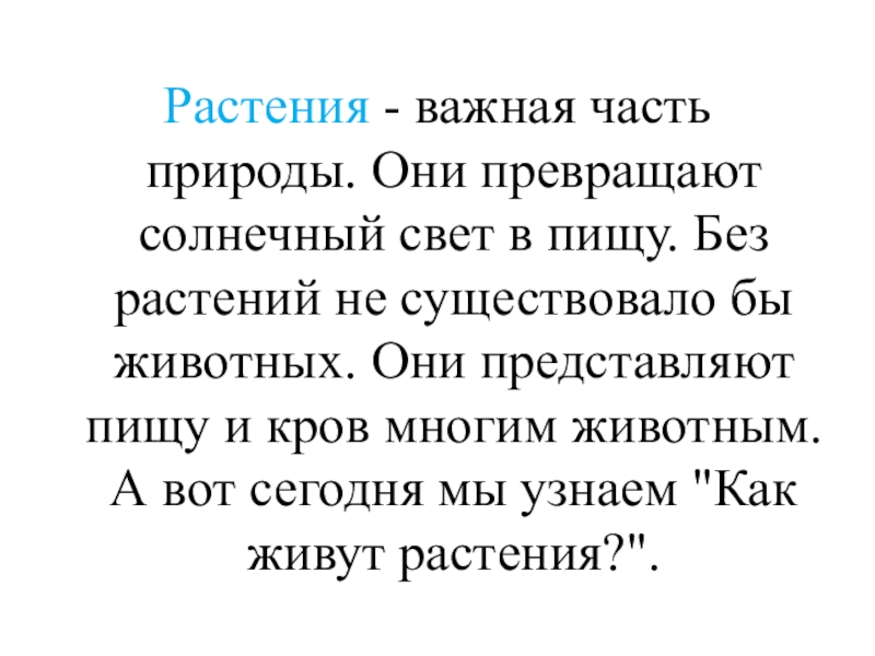 Растения - важная часть природы. Они превращают солнечный свет в пищу. Без растений не существовало бы животных.