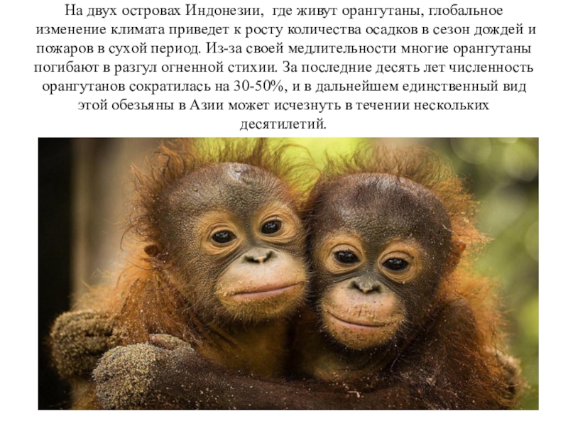 Слайд 10На двух островах Индонезии, где живут орангутаны, глобальное изменение климата приведет
