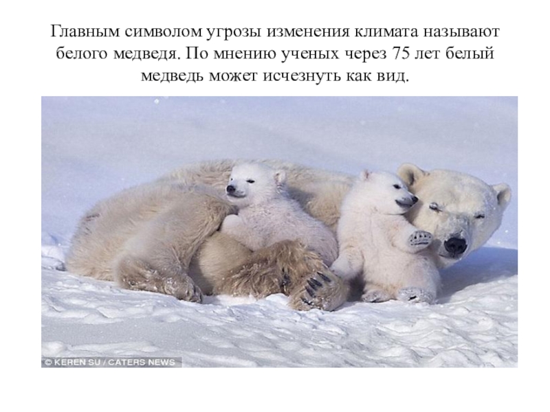 Слайд 3Главным символом угрозы изменения климата называют белого медведя. По мнению ученых