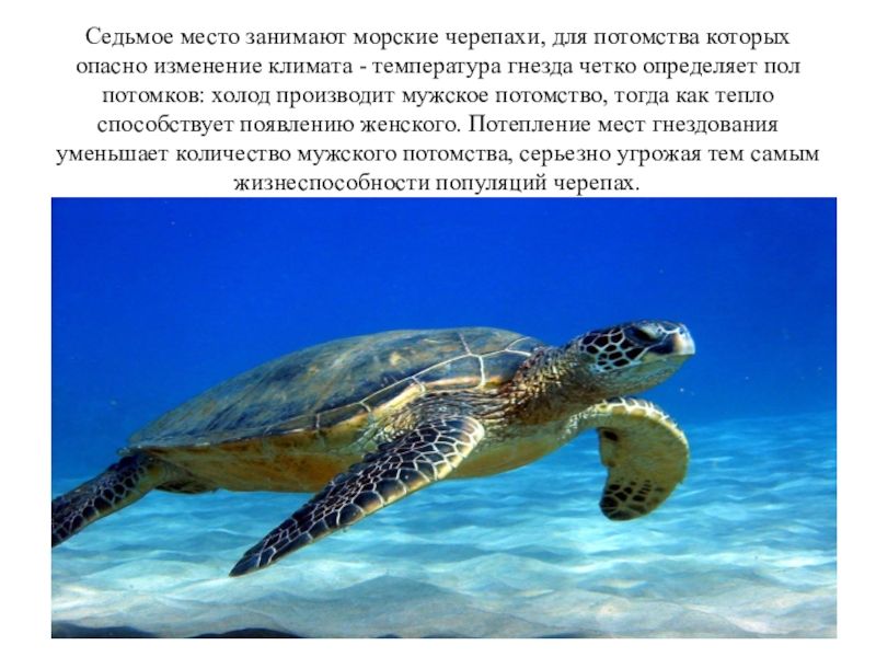 Слайд 9Седьмое место занимают морские черепахи, для потомства которых опасно изменение климата