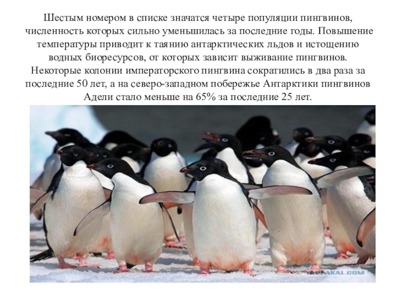 Слайд 8Шестым номером в списке значатся четыре популяции пингвинов, численность которых сильно