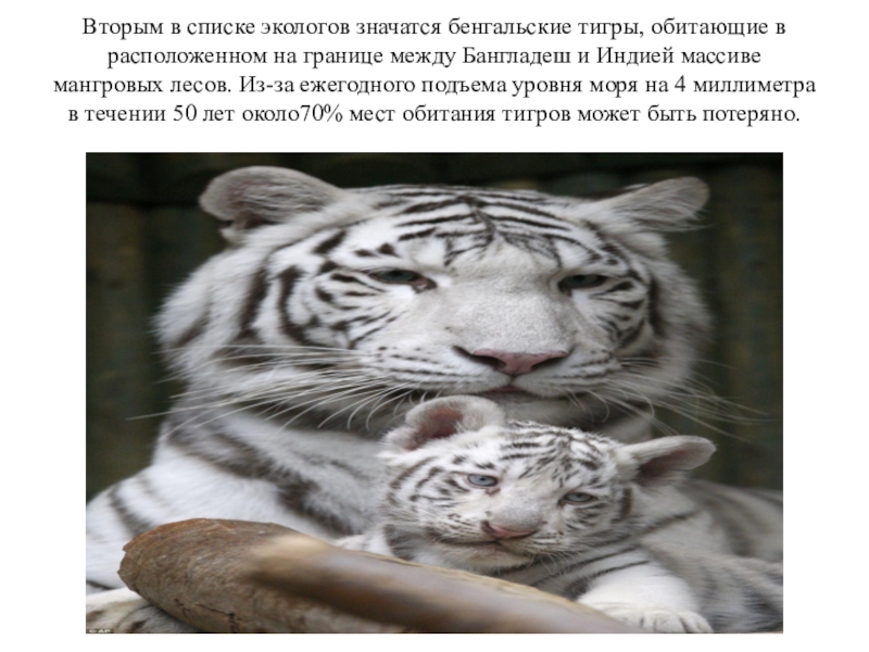 Слайд 4Вторым в списке экологов значатся бенгальские тигры, обитающие в расположенном на