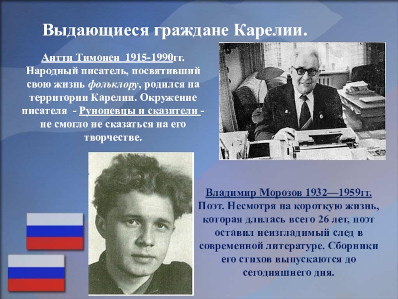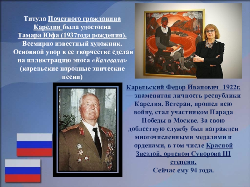 Карельский Федор Иванович 1922г. — знаменитая личность республики Карелия. Ветеран, прошел всю войну, стал участником Парада Победы в Москве. За свою доблестную службу был награжден многочисленными медалями и орденами, в том числе Красной Звездой, орденом Суворова III степени.