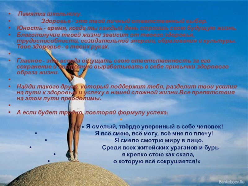 Памятка школьнику. Здоровье - это твой личный ответственный выбор.Юность - время, когда ты каждый день строишь свою будущую жизнь.Благополучие твоей жизни зависит от твоего здоровья, трудоспособности, созидательной