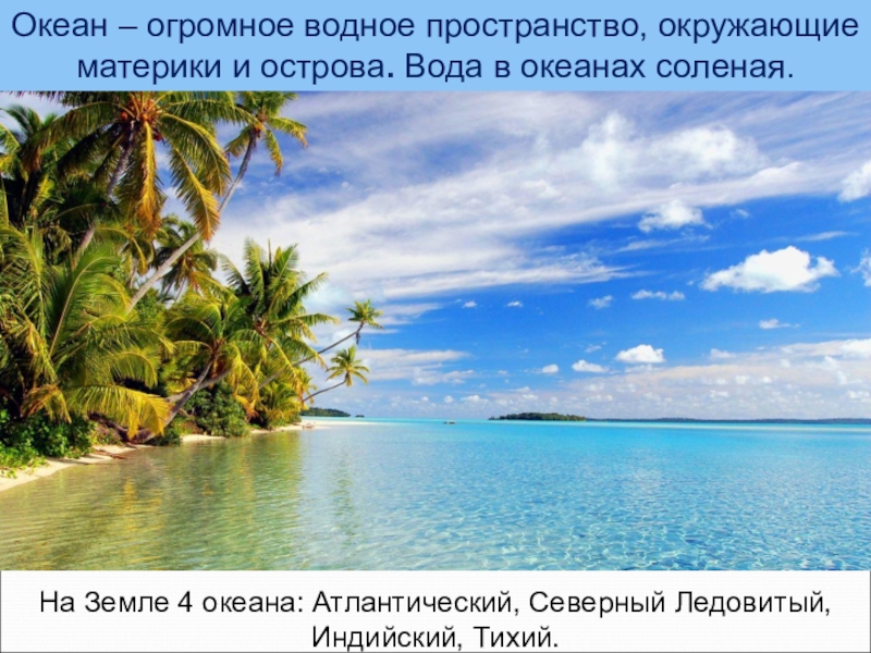 На Земле 4 океана: Атлантический, Северный Ледовитый, Индийский, Тихий.