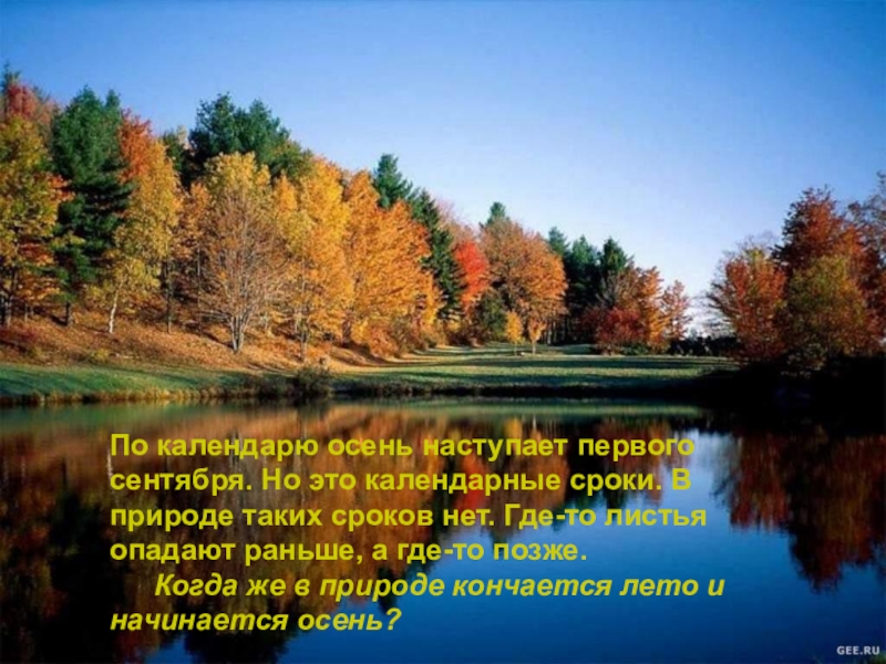По календарю осень наступает первого сентября. Но это календарные сроки. В природе таких сроков нет. Где-то листья опадают раньше, а где-то позже.